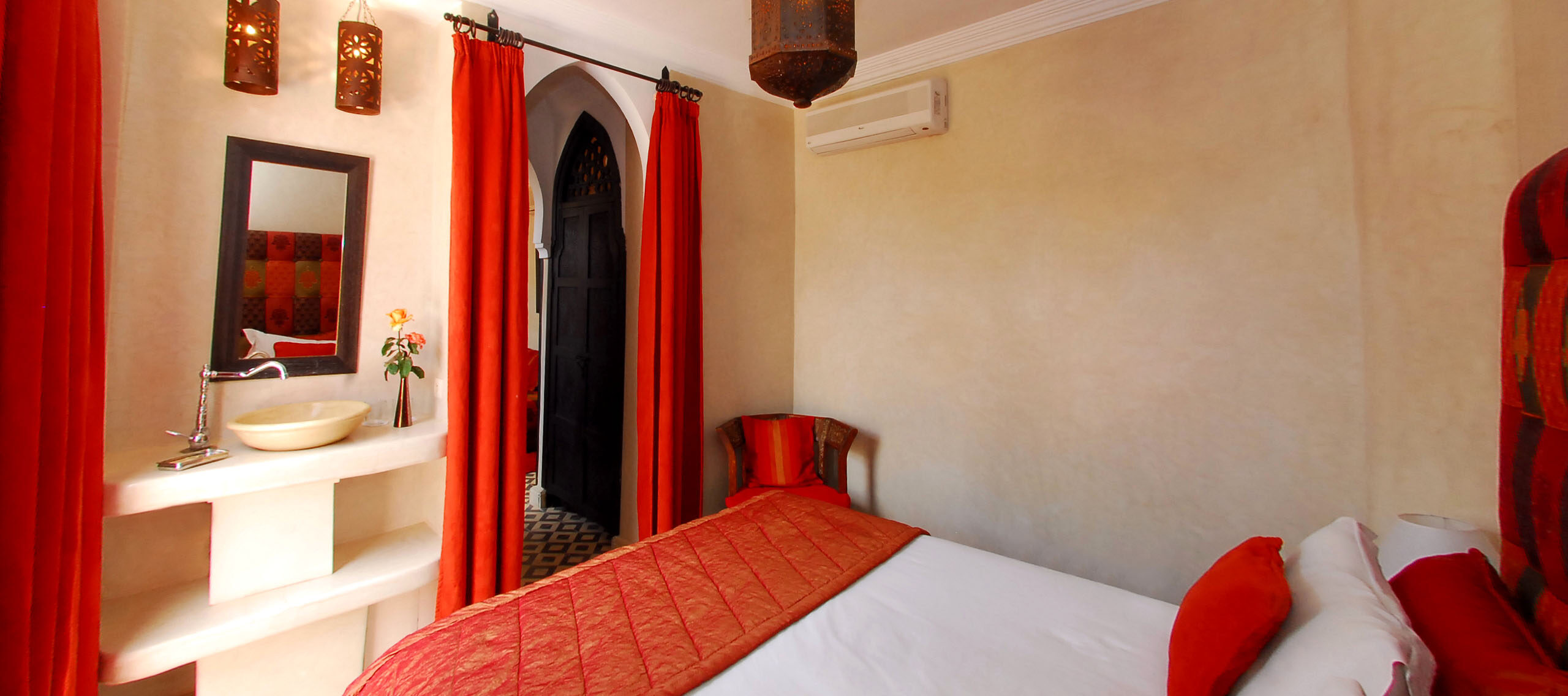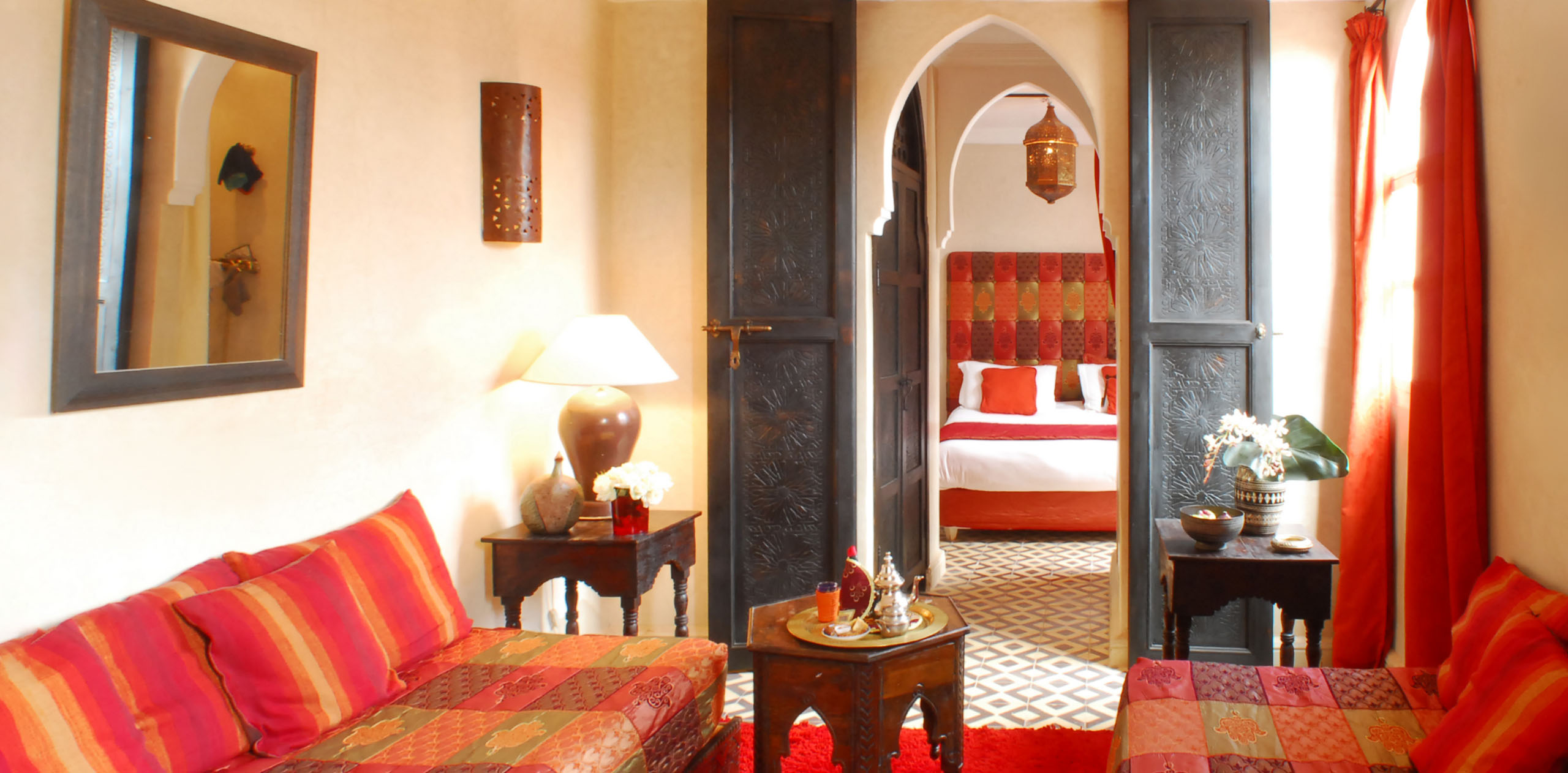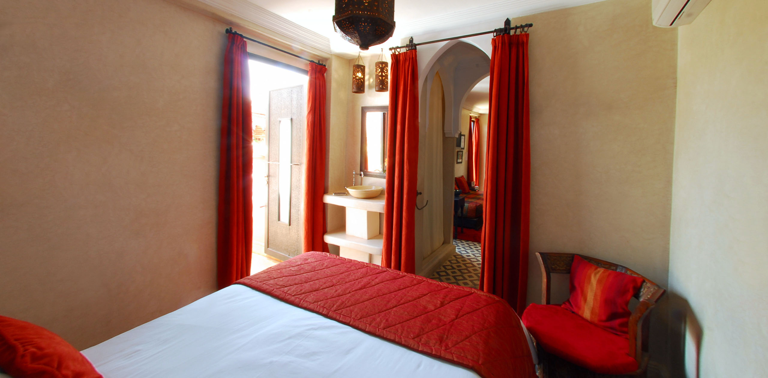 La suite Halaoua (la Douceur), est située sur la terrasse du Riad, la chambre à coucher est indépendante du salon. Cette chambre possède 2 canapés et est idéale pour une famille de 4 personnes.